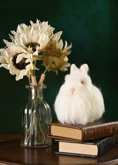 お耳をのぞいて、直径8センチのポンポン二つくらいのサイズになります。白、グレー、リンクス、オレンジ、ブラウン系の子が制作可能です。